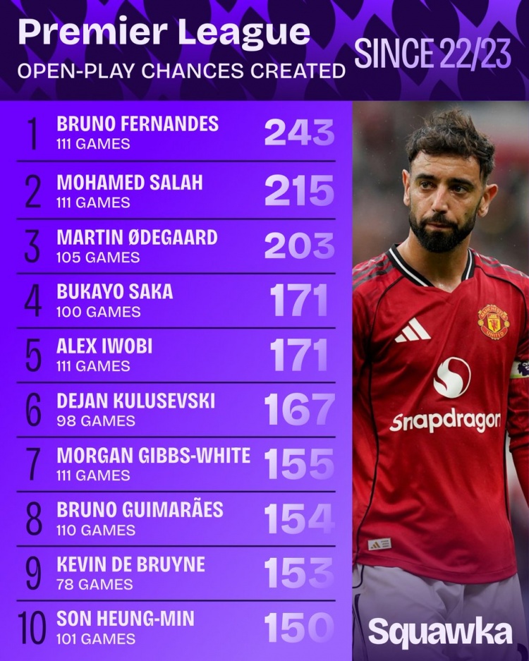 9月11日讯 数据显示,自2022/23赛季开始,B费是英超运动战创造机会最多的球员。